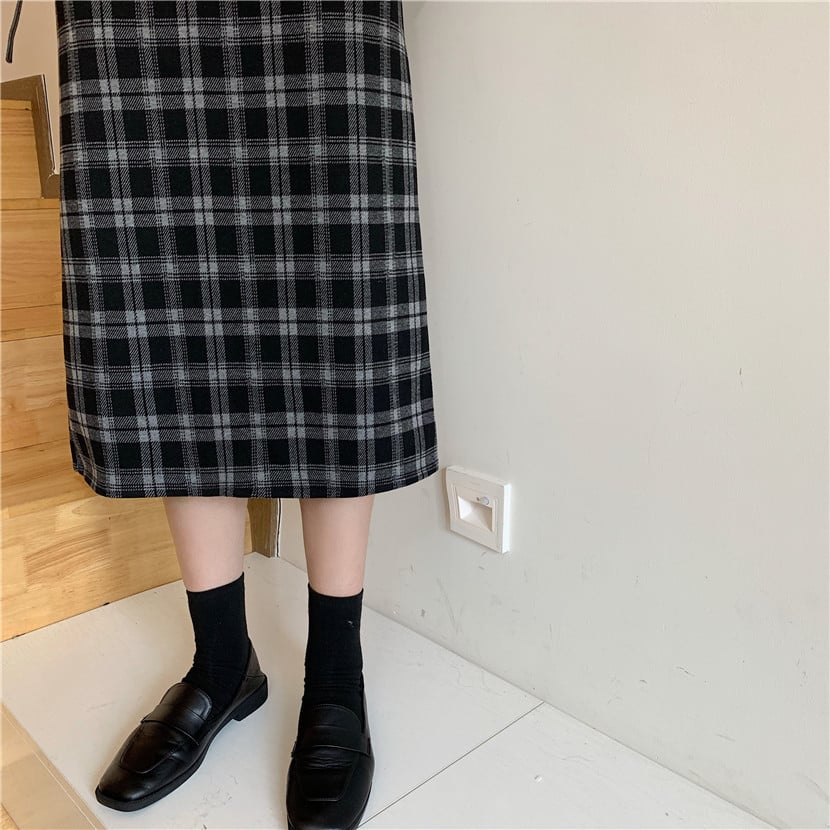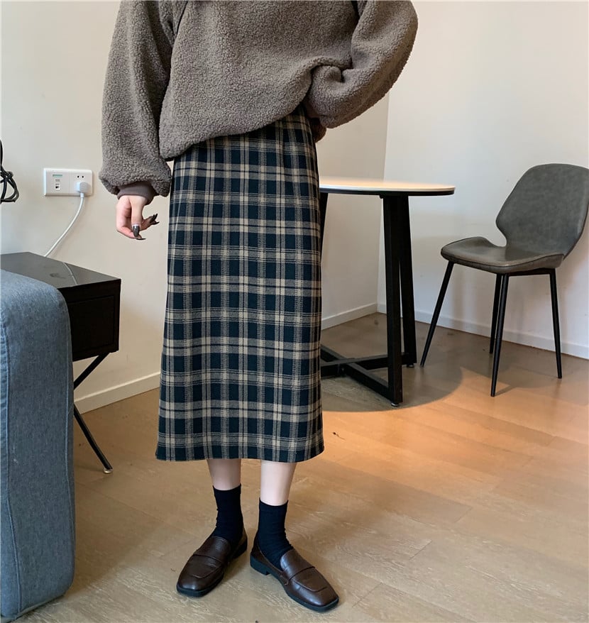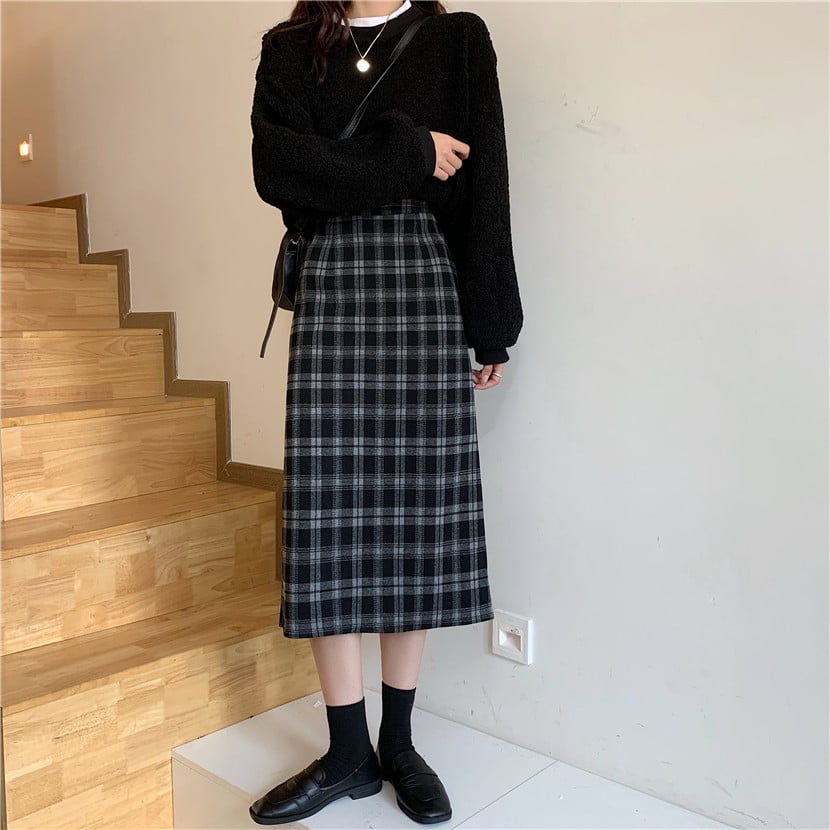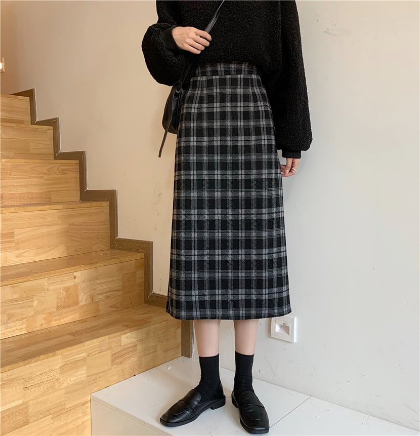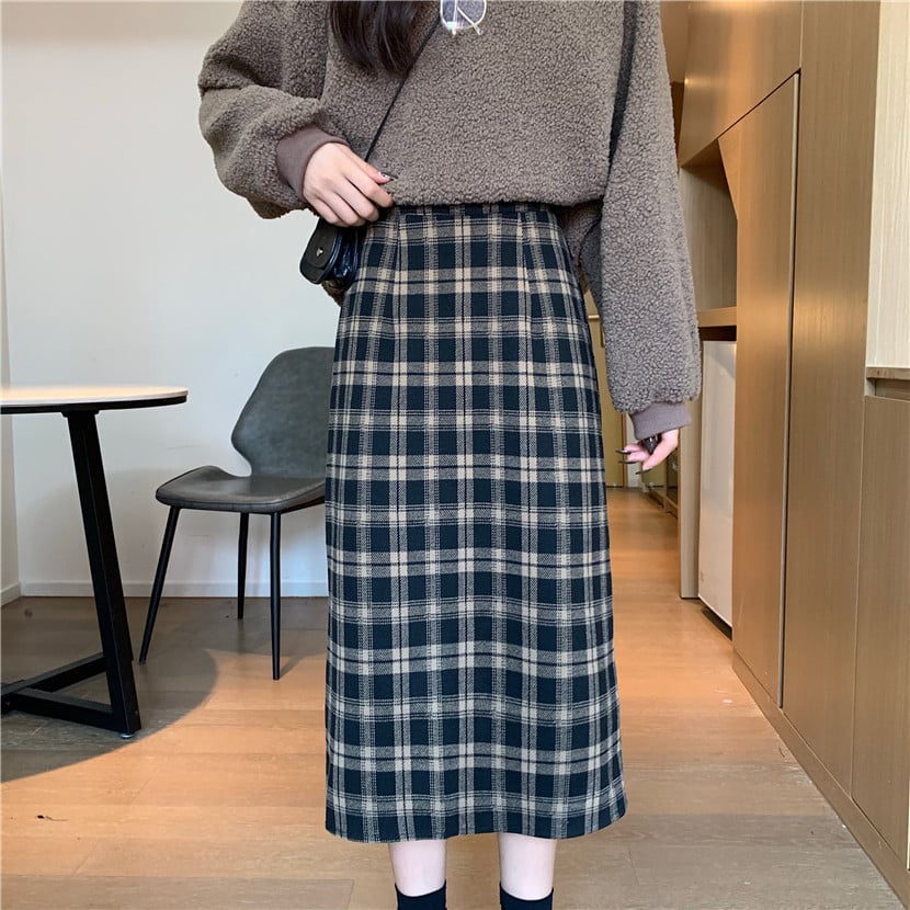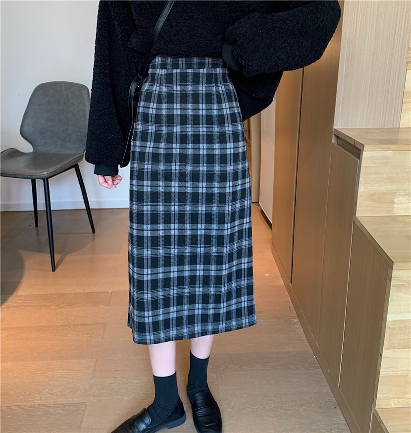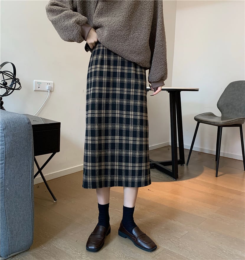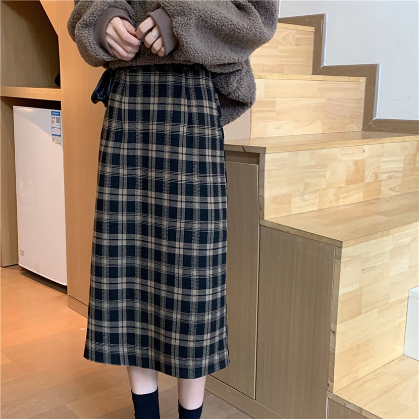 High Waist Retro Slim Woolen Plaid Mid-Length Skirt