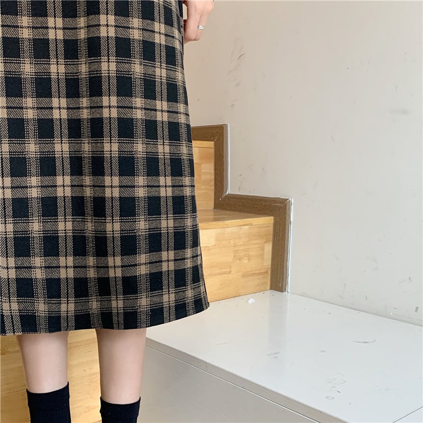 The classic check pattern adds a touch of sophistication, while the long skirt length provides a flattering silhouette that makes you feel confident and stylish. Available in a rich coffee color and classic black, you can easily switch up your look to suit any mood or event.