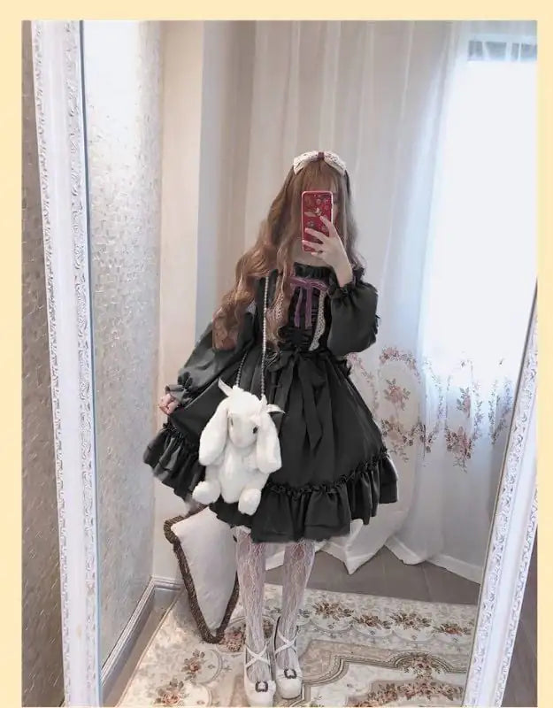 Lolita Skirt Black Long SleeveLolita Skirt Black Short SleevePuff Sleeves DetailElegant Midi SkirtSoft Fabric Texture