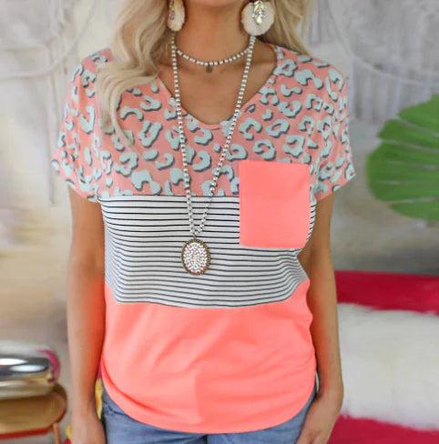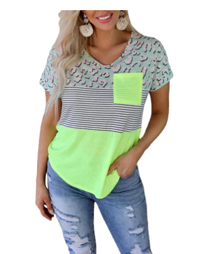 Striped Print Short-Sleeved Casual T-Shirt with Pocket