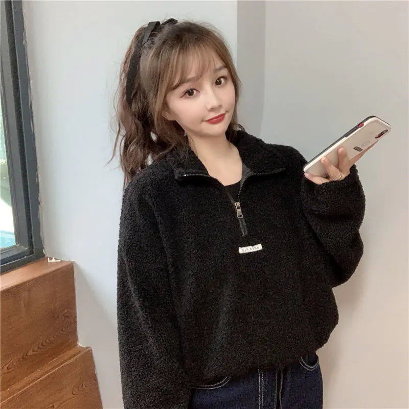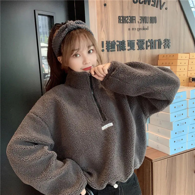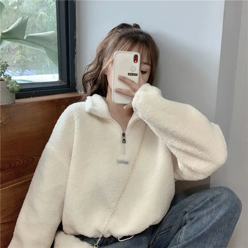Embrace the cozy and chic vibes of our lambswool sweatshirt, designed to keep you warm and stylish during the colder months. This thickened and plush outerwear features a trendy stand collar, making it the perfect addition to your wardrobe for a relaxed yet fashionable look.